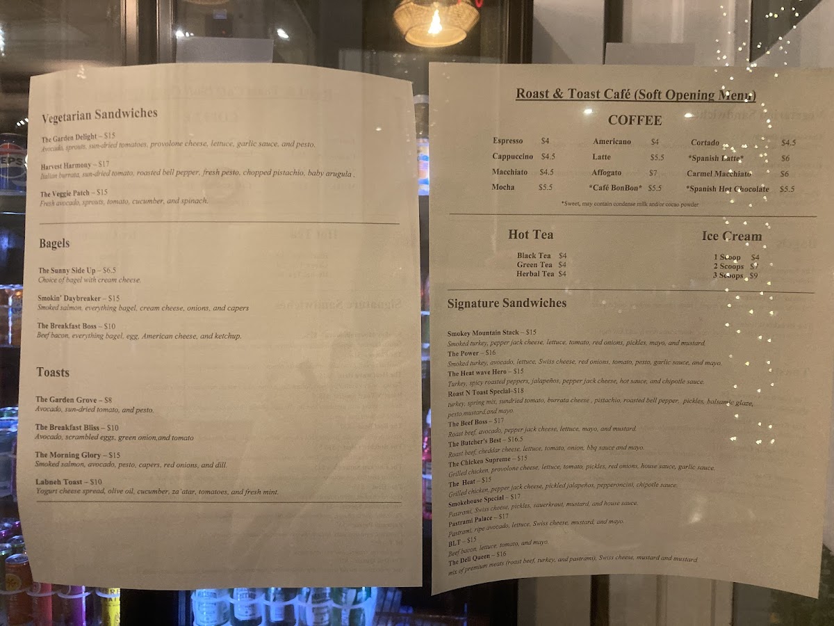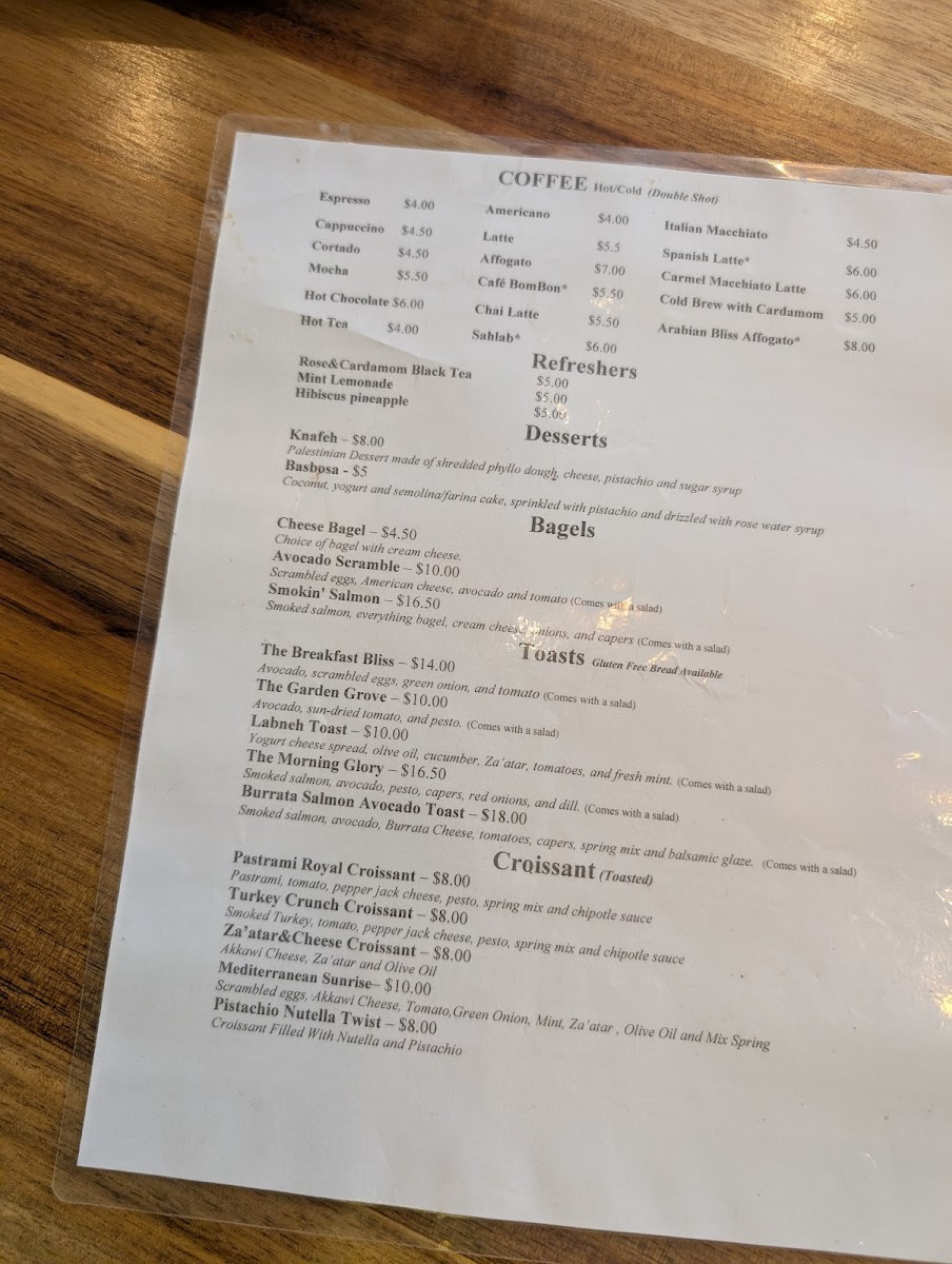 The menu at Roast&Toast Cafe is organized to cater to a variety of café needs including both beverages and light meals. It offers a selection of hot and cold coffee drinks such as espresso, americano, cappuccino, cortado, latte, mocha, affogato, and cold brew with cardamom. In addition to traditional coffee options, the menu features specialty drinks like Café BomBon—a layered espresso and condensed milk beverage—and chai lattes, as well as hot tea and Middle Eastern sahlab.